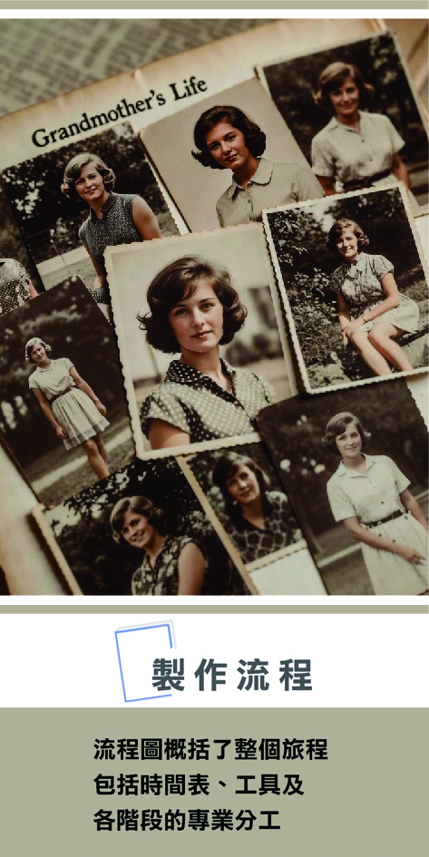 - 背景考察: 進行時代背景研究,搜尋相關史料、影像及紀錄片。